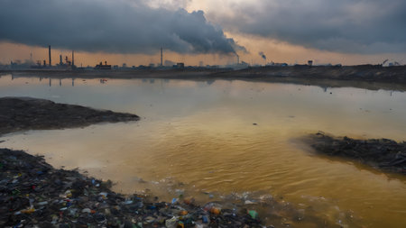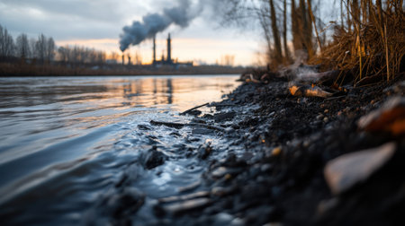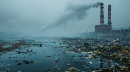 Industrial plant emitting toxic smoke into the atmosphere, polluting the surrounding environment and water with garbage