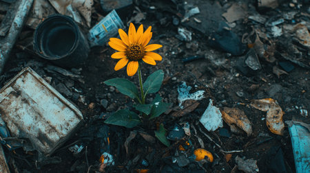 Bright yellow flower emerges from amongst refuse, illustrating the possibilities of life and renewal amid discarded materials in urban settings.