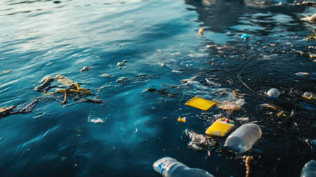 Ocean surface is cluttered with floating plastic, including bottles and bags, showing the severe issue of marine pollution today.