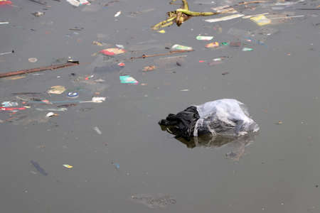 Trash and garbage floating on the surface of the water. Plastic waste and foam dumped into the water, causing sewage.