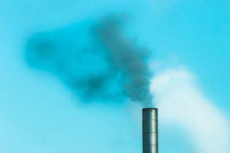 Environmental problem, environmental pollution, smoke from the pipe of an industrial plant or thermal power plant against a blue sky.