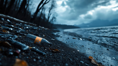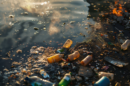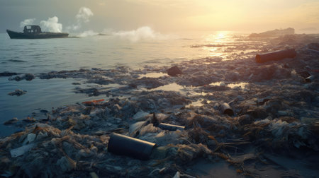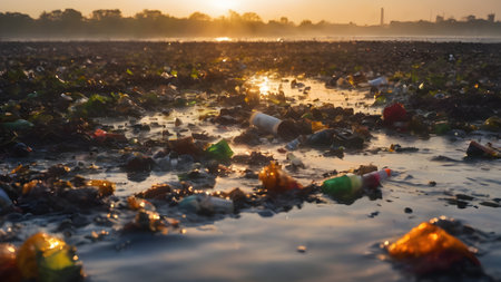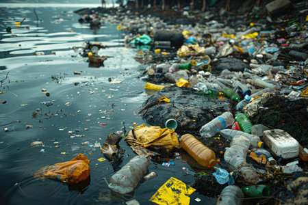 Plastic pollution littering a water shore