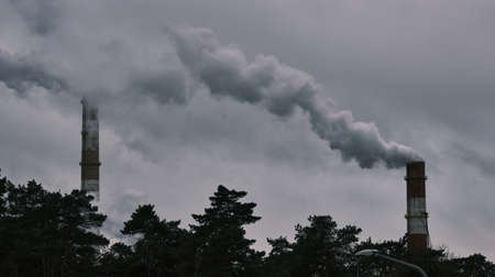 Smoke from pipes in the plant, polluting the environment. Dirty air in the sky.