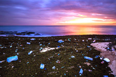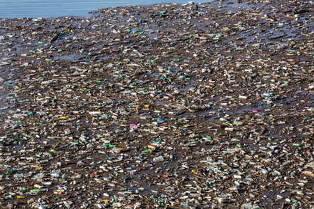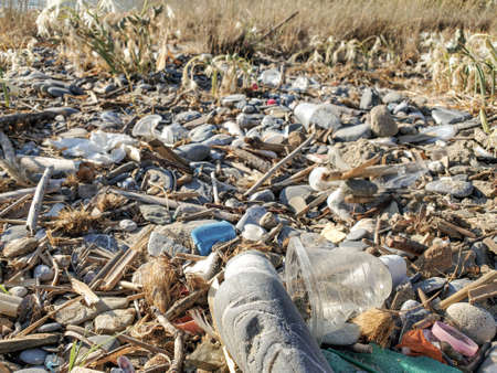 Dirty waste plastic garbage on the beach with outdoor sun low lighting.