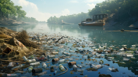 Water pollution an environmental disaster concept. Environmental damage. Dirty polluted water with garbages. Environment pollution concept. AI generated image
