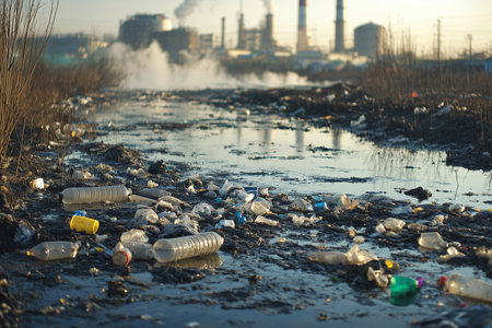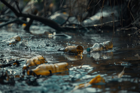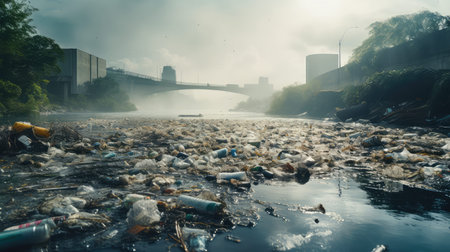 Pollution water bodies is pressing environmental issue, as seen this featuring plastic bottles floating surface of polluted waterway. scene evokes sense of urgency to address waste management