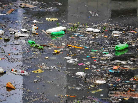 Wastage material plastic pollution presented on gutter water, Dirty polluted environment concept.