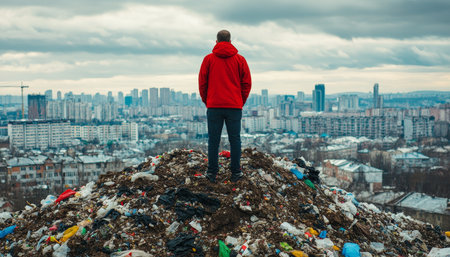 Man in a red jacket overlooks the city from a pile of trash, symbolizing urban struggles and resilience