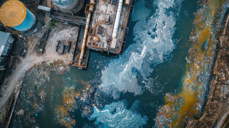 Aerial view of toxic waste flowing from industrial pipes into water, with a factory skyline behind
