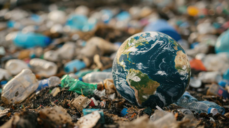 Powerful image showing planet Earth perched atop a pile of plastic waste emphasizing the contrast between the beautiful Earth and the surrounding pollution