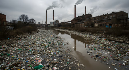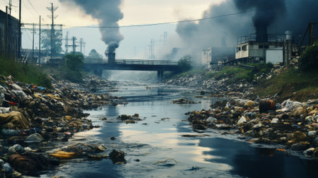 Polluted industrial river overflowing with plastic waste next to factories emitting smoke under a dark gray sky