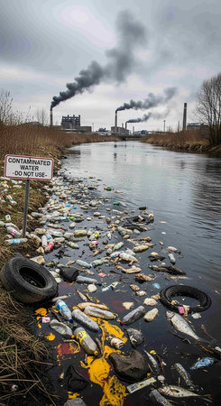 The image depicts plastic waste floating in a polluted waterway, illustrating the critical environmental issues facing our waterways and ecosystems.