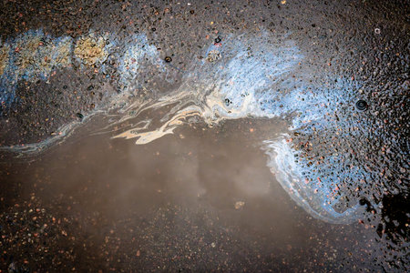 Color Gasoline fuel spots on Asphalt Road as Texture or Background. Environmental pollution concept