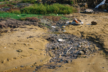 Polluted river bank with plastic and tin bottles