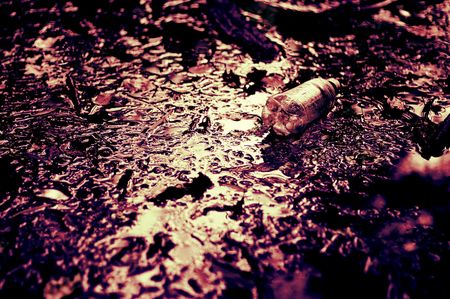 Bottles and other garbage in the burnt grass. Environment problem