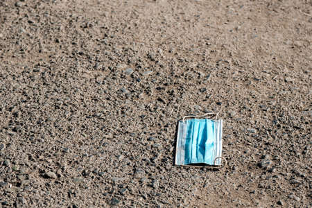 Close up shot of a used surgical mask, lying on the ground, illustration for the Covid-19 pandemic.