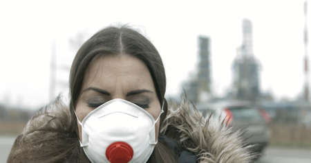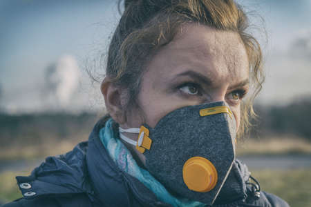 Woman wearing air pollution mask against smog, with urban industrial setting.