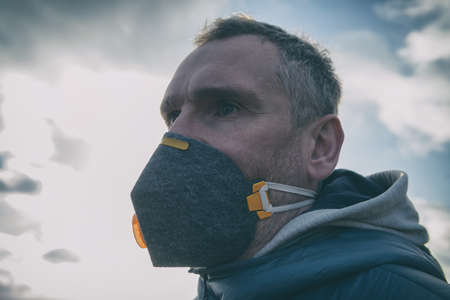 man wearing a real anti-pollution, anti-smog and viruses face mask; dense smog in air