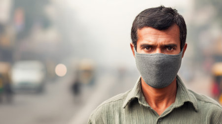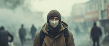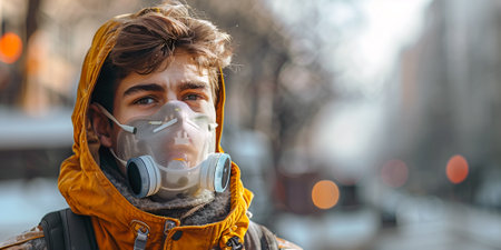 A close-up shot of a man wearing a protective mask in a polluted environment, on blurred city street background.
