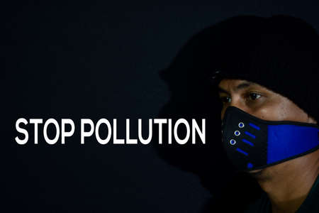 Bekasi. Indonesia. March 7 2020 : Young man use masker and stop pollution write on dark black background.