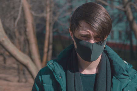A man wearing a black respiratory mask on his face. A man in the street in a black mask. Virus. Coronavirus. A guy in the spring on the street in a respiratory mask to protect against infection virus
