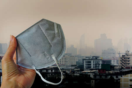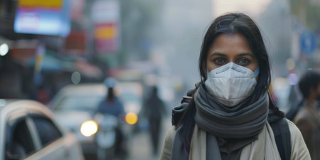 Woman wearing a real anti-pollution, anti-smog and viruses face mask; dense smog in air.