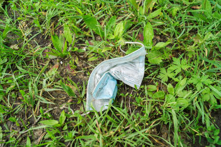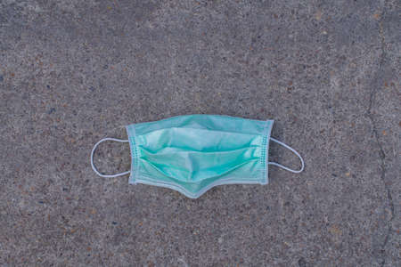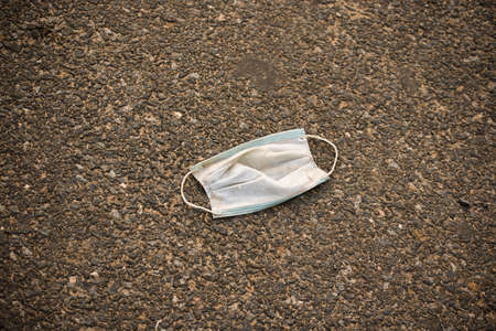Medical protection mask lost on the ground was used. Disposable mask lying on the street. Incorrectly discarding the used face mask