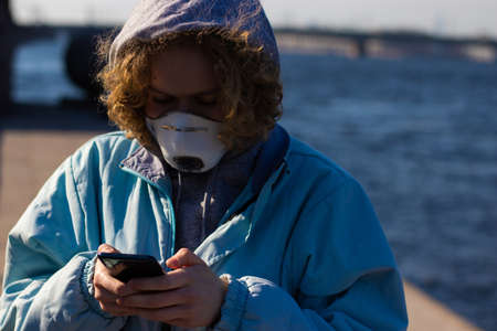 Girl using her phone on street. Health care concept. Teen with blonde hair wearing face protection medical mask. Protective respirator against viruses. News and information issue.