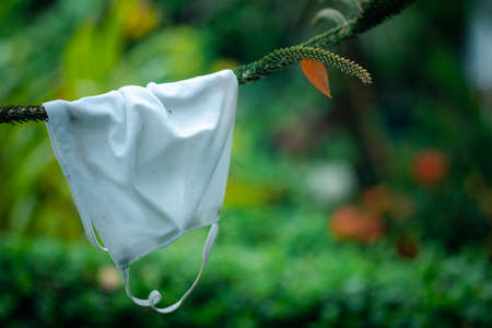 A white mask hangs off a tree branch in a forest - closeup. Due to insufficient face mask during the Covid-19 crisis. Corona virus quarantine.