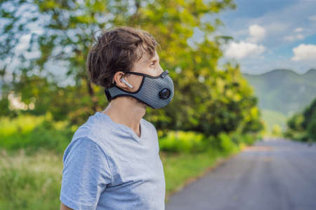 Man wearing mask protect fine dust in air pollution environment - people with protection equipment for air pollution concept