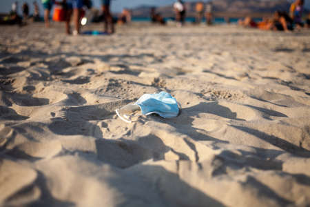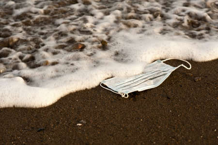 Waste during COVID-19 with sand in the background. Dumped into oceanic coronavirus single-use face masks. Environmental and coastal plastic pollution. Garbage on the beach