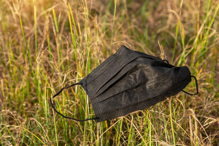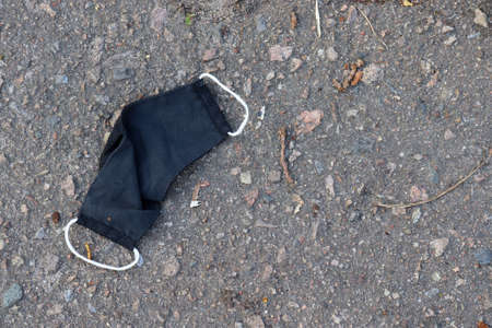Black protective mask on the street. Used pandemic face mask on the ground. Environment pollution problem