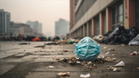 Mask is lying on the street. Garbage after coronavirus. Zero waste. Ecological lifestyle. Environmental pollution.