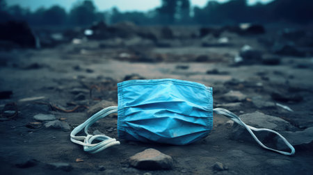 Used disposable facial medical mask thrown on dirt road as metaphor threat of environmental pollution and infection