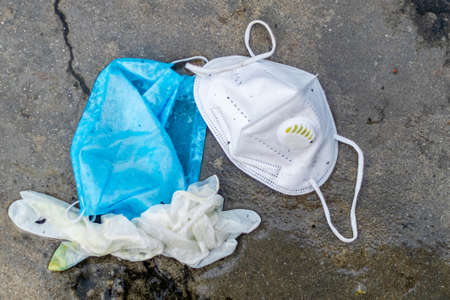 COVID-19 Waste or Litter Concept. Discarded Gloves, Medical Face Mask and N95 Mask Thrown Away After Use in the rain outdoors.