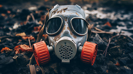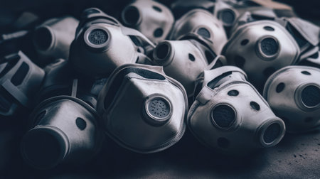 An artistic composition showcasing a pile of gray gas masks in a moody environment, representing themes of safety, protection, and public health concerns in uncertain times.