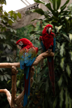 Red and blue macaws sitting on a branch in the garden. Botanical garden in Vancouver, British Columbia.