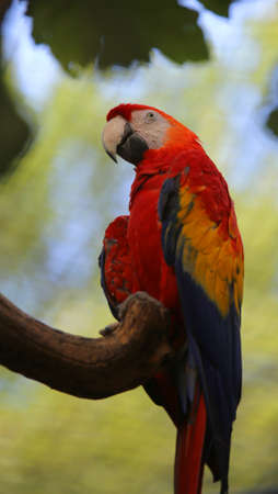Red scarlet macaw on branch, colorful parrot bird. Wild life and animals.