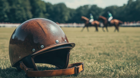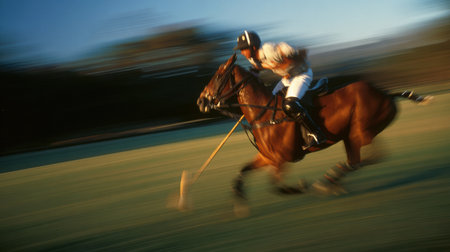 A close-up shot of a polo ball on a grassy field, with a blurred rider in the background The image captures the essence of the sport, with its focus on the ball and the rider's silhouette The golden light of the setting sun adds a warm and inviting atmosphere The image evokes a sense of speed, skill, and excitement It is perfect for use in marketing materials for polo events, equestrian publications, or any project that needs a touch of sophistication and elegance AI Generative
