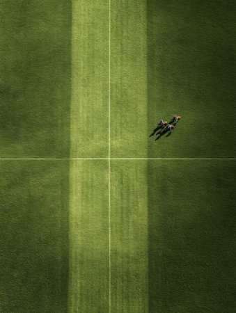 An aerial perspective shows two horses and jockeys competing in a race on a grassy course. Parallel lines mark the lanes on the daytime track.