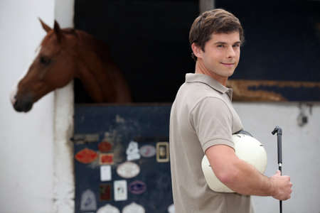 Asian male jockey in racing attire with a horse at a racetrack. Concept of horse racing, male athlete, sport competition.