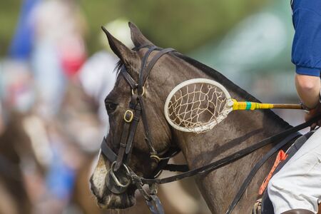 Polocrosse equestrian sport horses pony umpire rider players closeup fast game action.