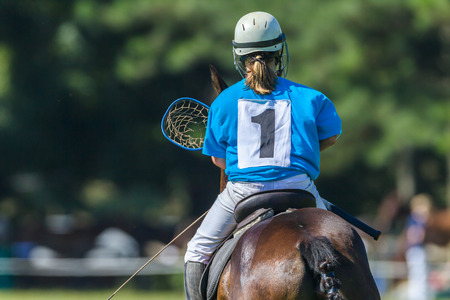 Polocrosse horse teenage girl player closeup unidentified riding equestrian sport game.