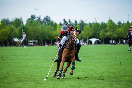 Polo-Cross rider player racket unidentified on horse pony in fast exciting equestrian sport.