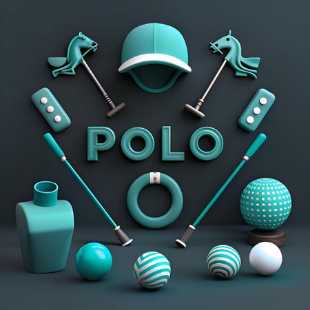 Fun and vibrant 3D illustration of a polo game setup. featuring a polo mallet. horse. ball. cap. and the word POLO in bold letters. Perfect for promoting sports leisure or a healthy lifestyle.