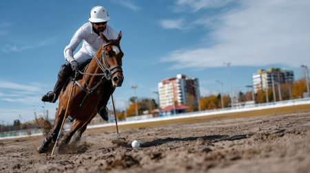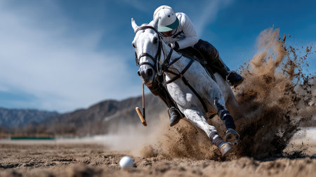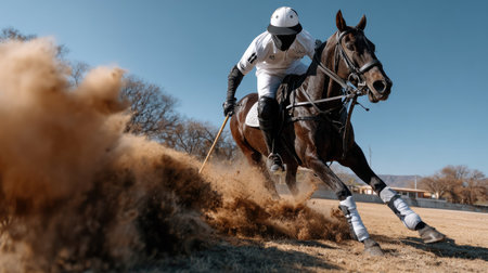 Experience the thrill of a polo match as a skilled rider and horse navigate the field, kicking up dust on a bright sunny day in this captivating scene.