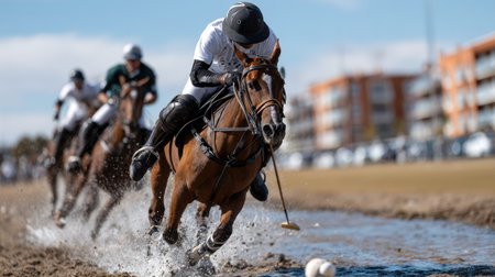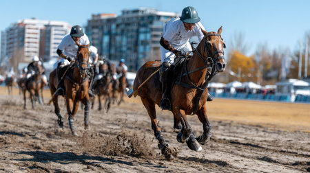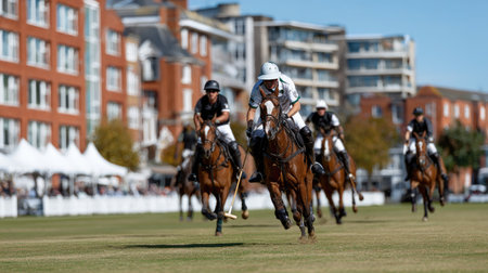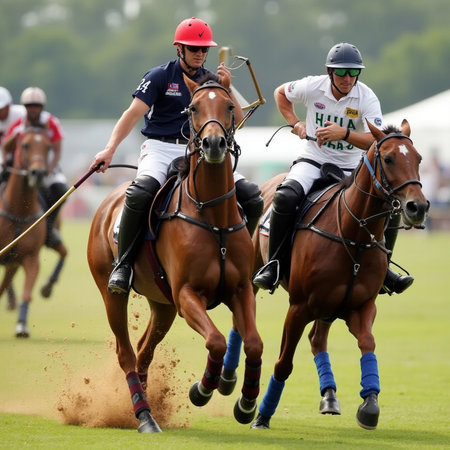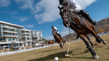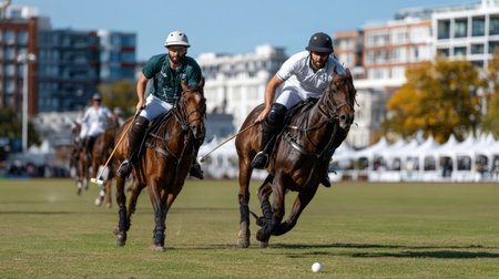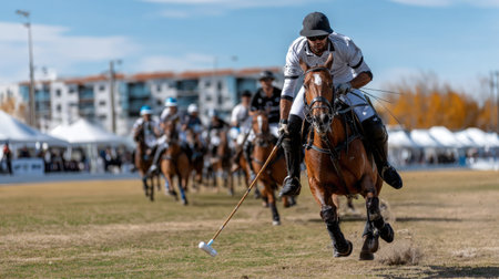 Experience the thrill of a dynamic polo match featuring fast-moving horses and skilled riders. Capture the excitement of this outdoor sport on a sunny day.