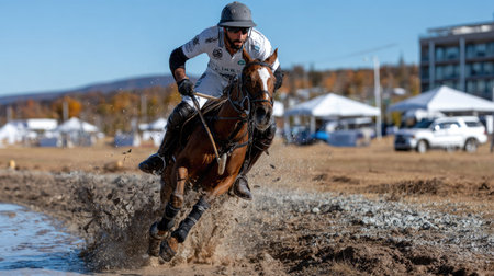 A dynamic image capturing a rider skillfully maneuvering a horse through water during an equestrian sport event. The exciting splash and backdrop of tents reflect the essence of outdoor competition in the autumn.