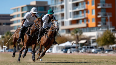 An exhilarating scene from a polo match showcasing two skilled riders and their powerful horses in swift action. Bright sunny day, lively atmosphere.