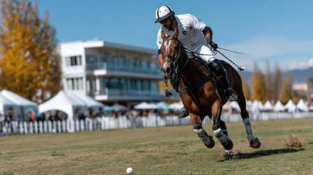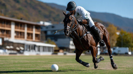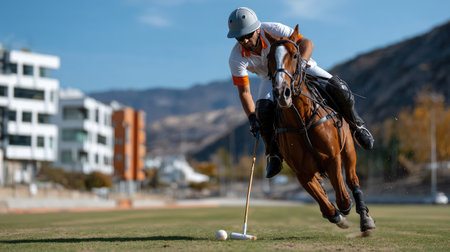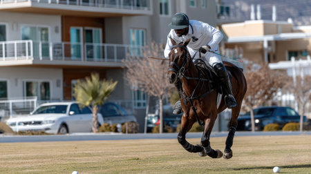 A thrilling moment captured during a polo match, showcasing a rider skillfully galloping on a horse against a backdrop of modern architecture and nature.
